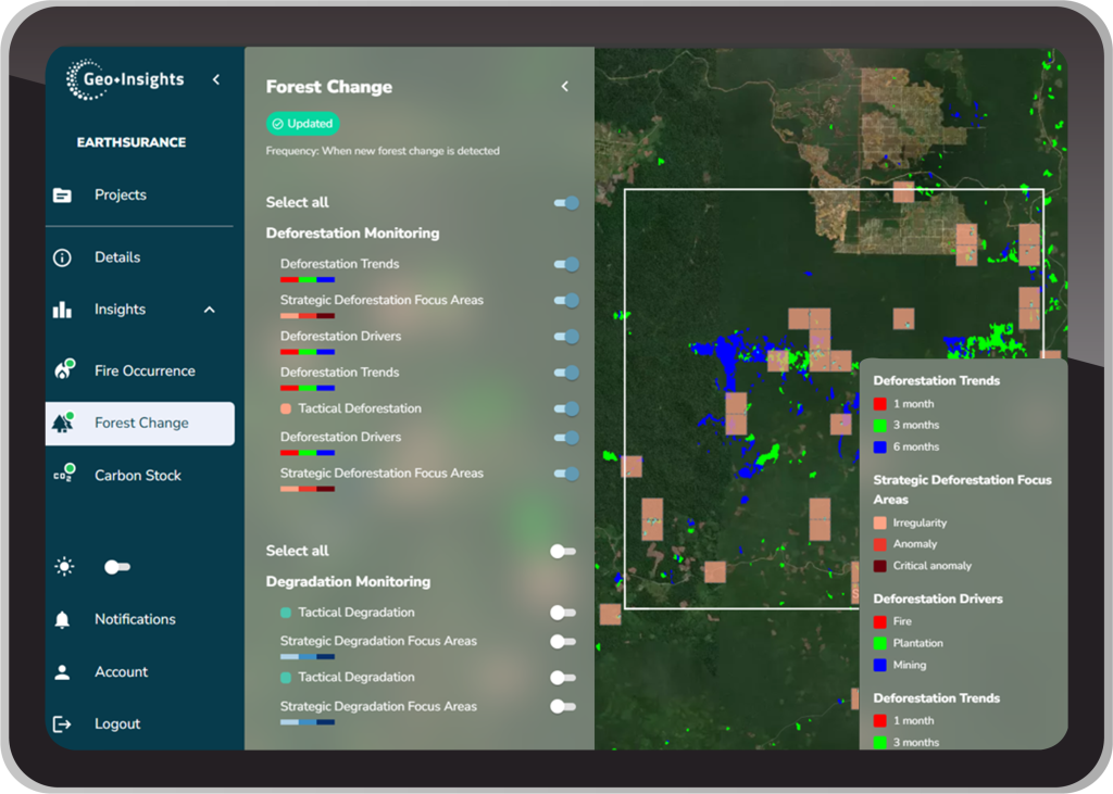 Leveraging cutting-edge radar satellite technology, Earthsurance detects deforestation and forest degradation even beneath the canopy. The platform automatically runs detection analyses as soon as new imagery is captured, instantly notifying you of any anomalies for timely intervention.